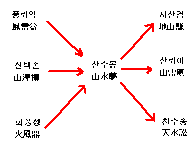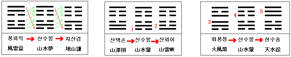 산수몽 ( 山水蒙 ) 의 운세가 올수 있는 경우는 풍뢰익(風雷益), 산택손(山澤損), 화풍정(火風鼎)의 3 경우이다.