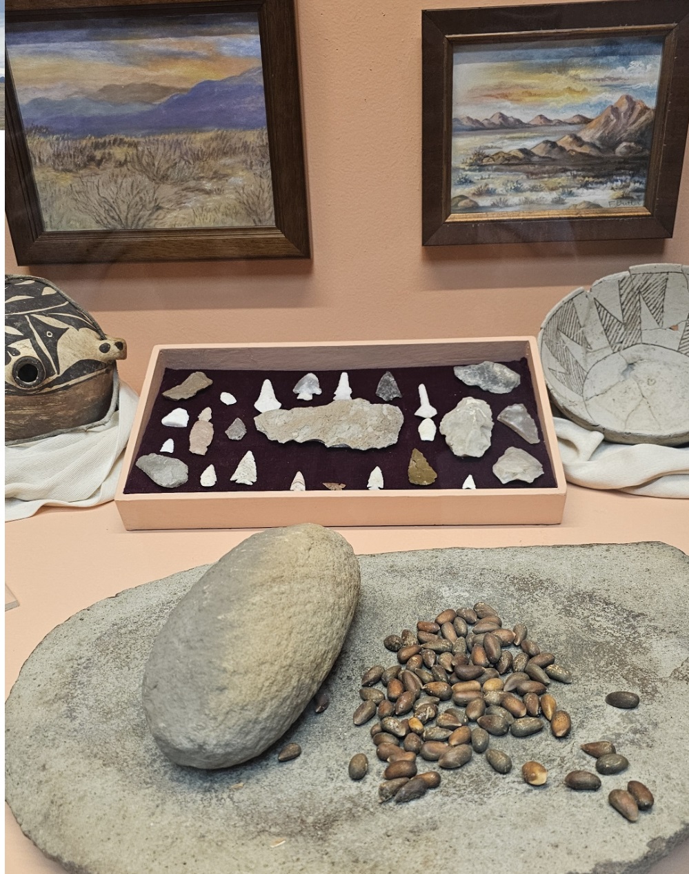 라스베가스에서 북쪽으로 210마일 정도 떨어진 곳에 Tonopah 라는 도시가 있다 이곳에 있는 박물관을 방문하여 고조선 사람들(인디언)의 생활상을 구경한 것들이다 전시물을 보면서 이들이 우리 조상과 같은 뿌리라는 것을 느끼지 않을 수 없었다 << 잣을 갈아 먹은 멧돌 흔적 / 화살촉 / 석기 생활도구 / 그릇 >>