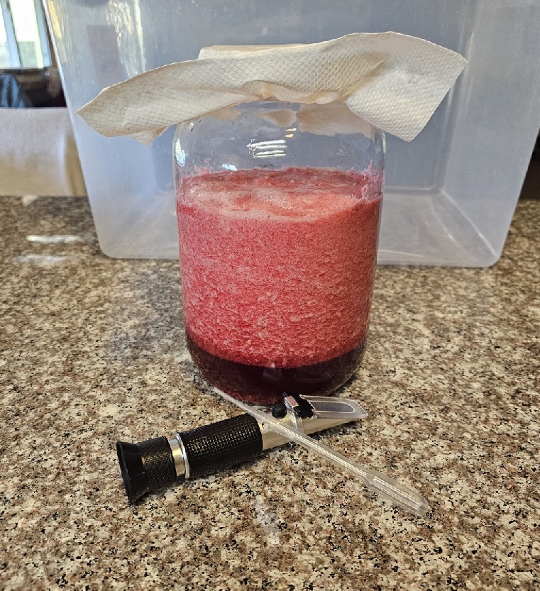 수확한 석류의 당도를 측정해보니 14 Brix 가 나왔다 Yeast 를 조금 ( 티스푼 반 정도 ) 넣고 1~2일이 지나면 가라 앉아있던 찌꺼기가 위로 올라오고 이때부터는 뚜껑을 꼭닫아 외부 공기와의 접촉을 피해야한다 10일 정도 지나면서 위로 올라가 있던 찌꺼기들이 서서히 가라 앉기 시작하였다. 이때부터 내부에서 완숙한 알콜 발효가 지속 됨으로 이렇게 1~2 개월이 지나면 당도가 8~9 Brix 인 석류 와인( Wine ) 이 되는 것이다