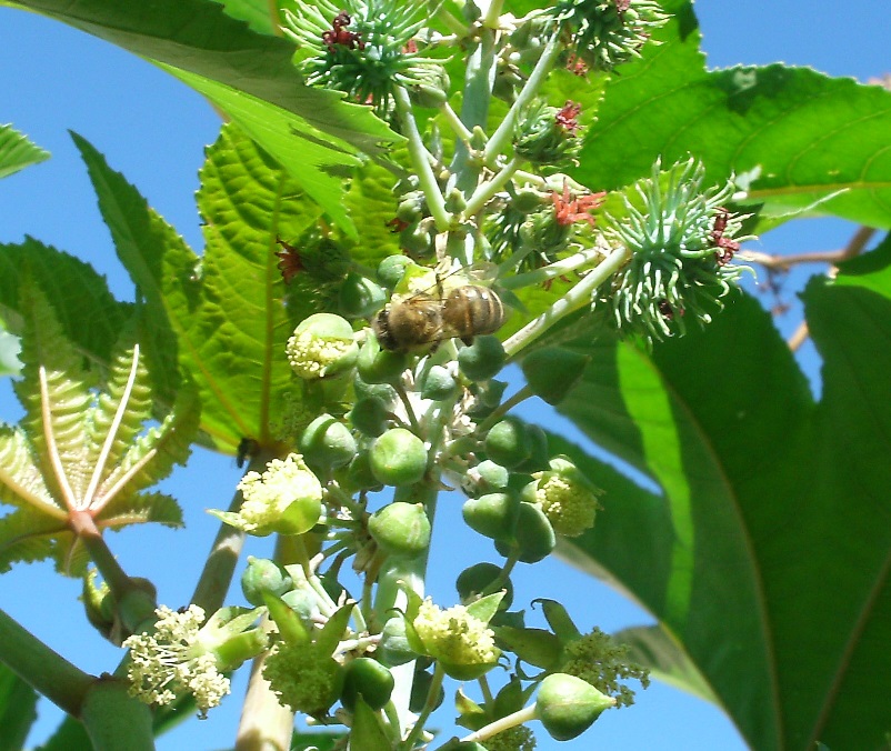 피마자 꽃은 시기적으로 가장 더운 여름에 핀다. 이렇게 더운 날씨이지만 벌( Bee )들은 아침 저녁으로 덥지 않을때를 이용해서 정말 대단한 집념이다.