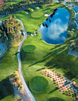 A par 72 golf course designed by Ted Robinson with stunning views of the Spring Mountains and the Las Vegas Strip. Rhodes Ranch promises to reward golfers, but also dare them to think twice before taking advantage of several tempting and spectacular drives. Mounding fairways, relentless bunkers, sweeping streams and a myriad of reflective water hazards present a serious challenge to all golfers. 10-15 minutes from the Las Vegas Strip. Soft spikes are required.