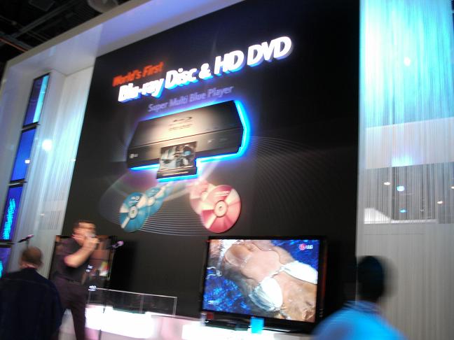 세계 최초로 개발하여 만든 수퍼 멀티 블루 (SMB) 플레이어 를 소개하고 있는 장면. 이 제품은 블루레이 ( Blu-Ray ) 시스템과 HD DVD 시스템의 시꺼러운 음악과 LG 제품이 세계 최고라고 입에 거품을 물면서 떠들고 있는 사람의 목소리,,, 2007년이 LG 전자의 기술이 성공하는 한해가 되기를 기원합니다. |