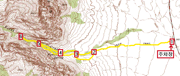 등산로 이야기 주차장에서 왕복 3.0 마일 ( 4.8 Km ) 거리이다. 1 지점(주차장)에서 2 지점까지는 자갈길인데, 약 30분 정도 소요된다. 2 지점은 계곡으로 가는 길과 언덕으로 둘러가는 길이 있는 3 거리이다. 3 지점에는 물이 있고 주위에 머루 나무도 자생하고 있다. 4 지점은 계곡길과 언덕길로 갈라지는 곳이다. 4 지점에서 언덕길로 5 지점까지는 20분 정도 소요된다. 5 지점 부터는 강의 계곡을 타고 올라가야 한다. 6 지점 ( 등산로 끝 지점 ) 은