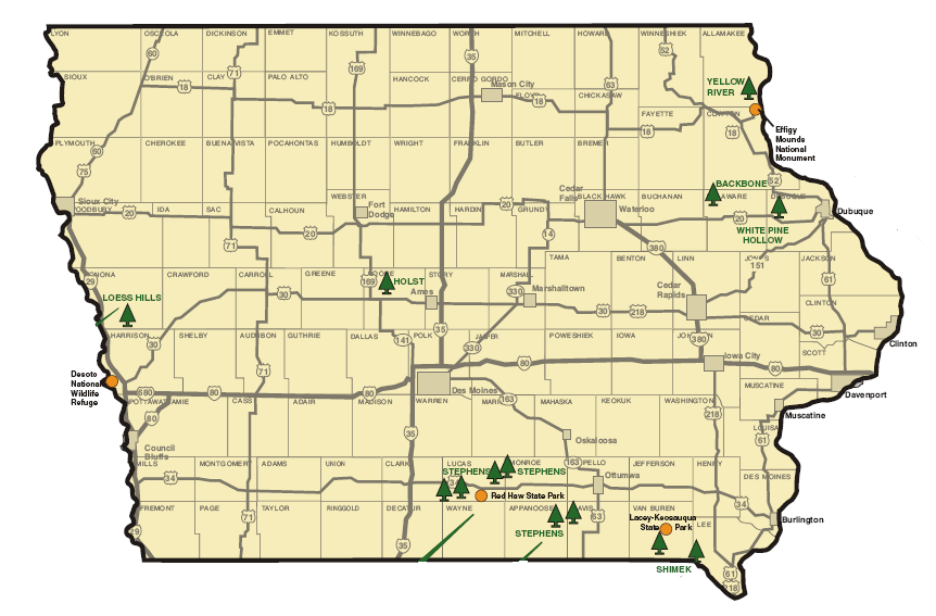 ¾ÆÀÌ¿À¿Í (IA)ÁÖ¿¡ ÀÖ´Â State Forest Yellow River State Forest --- 8,503 acres -- Northeast Iowa Shimek State Forest --- 9,148 acres --- oak-hickory forest -- Southeast Iowa. Stephens State Forest --- 14,112 acres -- South Iowa Loess Hills State Forest --- 10,600 acres --- West Central Iowa. Backbone State Forest White Pine Hollow State Forest Holst State Forest Barkley State Forest Pilot Mound State Forest Gifford State Forest
