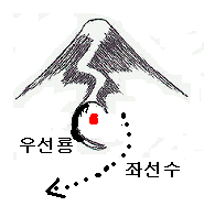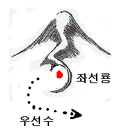 산의 흐름 ( 좌선룡 / 우선룡 ), 물의 흐름 ( 좌선수 / 우선수 ) 산(山)이 흘러가는 방향에 따라 우선룡(右旋龍) 와 좌선룡(左旋龍)으로 나누어지는데, 물이 흘러가는 방향에 따라 우선수(右旋水) 와 좌선수(左旋水)로 나누어지는데, 즉 산(山) 과 물(水) 의 방향을 반대로 이야기하고 있는데,