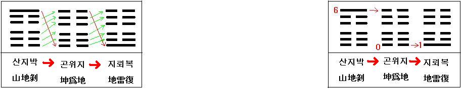 산지박 ( 山地剝 ) 에서 곤위지(坤爲地)으로,,,, 곤위지(坤爲地)에서 지뢰복 ( 地雷復 )으로 바뀌어 나간다.