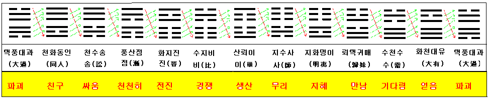 천화 동인 ( 同人 ) : 절망의 상태에서 벗어나면서 마음을 나누는 친구를 만난다. 천수 송 ( 訟 ) : 친구들의 의견이 서로 다르지만 조정하여 각자의 역할 분담이 정확하게 이루어 진다. 풍산 점 ( 漸 ) : 움직이지 않고 있던 것이 아주 천천히 움직이기 시작한다. 화지 진 ( 晉 ) : 발전의 속도가 빨라진다. 수지 비 ( 比 ) : 누구가 더 많이 발전해 나가는지 경쟁이 치열해진다. 산뢰 이 (頤) : 경쟁에서 살아 남도록 치고 박고 경쟁을 하면서 최후의 승자를 가린다.