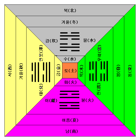 계절에는 봄, 여름, 가을, 겨울이 있고, 방위에는 동, 서, 남, 북이 있는데, 이들이 오행(五行) 과 서로 어떤 관계가 있는지 살펴 보기로 하자.