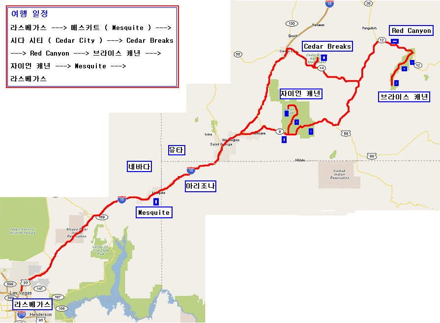 ¼Ò¿ä ½Ã°£ : 14 ½Ã°£ ÀÏÁ¤ : ¶ó½ºº£°¡½º¸¦ Ãâ¹ßÇÏ¸é¼ »óÁ¡¿¡ µé·¯ °£´ÜÇÑ ½Ä»çÁغñ¸¦ ÇÏ¿© Ãâ¹ßÇÑ´Ù. ¶ó½ºº£°¡½º¿¡¼ ¾ÆÁÖ ÀÏÂï Ãâ¹ßÇÏ¿©¾ß ÇÑ´Ù. ( ÁÖ·Î »õº® 6½Ã ÀüÈÄ ) ¶ó½ºº£°¡½º¸¦ Ãâ¹ßÇÏ¿© 15¹ø North ¸¦ Ÿ°í 1½Ã°£ 30ºÐ Á¤µµ °¡¸é ¸Þ½ºÅ°Æ® ( Mesquite ) °¡ ³ª¿À´Âµ¥ ¿©±â¼ ´Ù½Ã 2½Ã°£ Á¤µµ ¿Ã¶ó°¡¸é ½Ã´Ù ½ÃƼ (Cedar City ) °¡ ³ª¿À´Âµ¥ À̰÷¿¡¼ ´Ù½Ã 1½Ã°£ Á¤µµ °¡¸é Red Canyon Visitor Center °¡ ³ª¿Â´Ù. ±×¸®°í ´Ù½Ã 30ºÐ Á¤µµ °¡¸é ºê¶óÀ̽º ij³âÀÌ ³ª¿Â´Ù. ºê¶óÀ̽º ij³âÀ» ±¸°æÇϴµ¥´Â 1½Ã°£ 30ºÐ Á¤µµ °É¸°´Ù. ºê¶óÀ̽º ij³âÀ» ³ª¿Í ÀÚÀ̾ð ij³â ±îÁö ¿À´Âµ¥´Â ¾à 2 ½Ã°£ Á¤µµ °É¸°´Ù. ÀÚÀ̾ð ij³âÀ» ±¸°æÇϴµ¥´Â ¾à 1½Ã°£ 30ºÐ Á¤µµ °É¸°´Ù. ÀÚÀ̾ð ij³âÀ» ³ª¿Í ¸Þ½ºÅ°Æ® ( Mesquite ) ±îÁö´Â ¾à 2 ½Ã°£ Á¤µµ °É¸°´Ù. ¸Þ½ºÅ°Æ® ( Mesquite ) ¿¡¼ ¶ó½ºº£°¡½º±îÁö´Â ¾à 1 ½Ã°£ 30ºÐ Á¤µµ °É¸°´Ù.