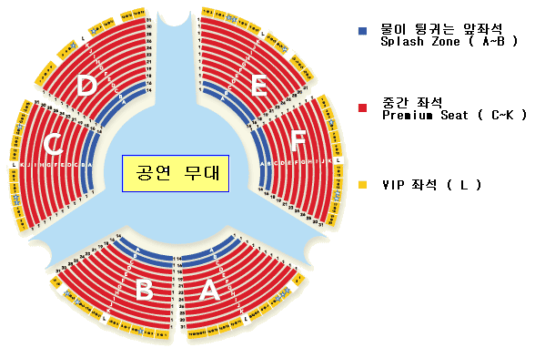 좌석 및 입장료 무대와 가장 가까운데 물이 튀기는 좌석 ( A~B 좌석 / 노란색 ) : $ 99.00 위의 가격에서 라스베가스의 쑈 티켓 가격에는 정부에서 붙이는 세금이 있고, 물이 튀기는 앞 좌석을 제외하고는