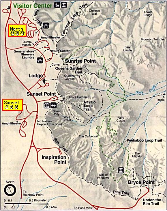 선셋 포인트 ( Sunset Point )에서 아래 계곡을 내려갔다 올라오는 Navajo Loop Trail 이 있는데 거리는 1.4 마일 ( 2 Km ) 정도이지만 걸리는 시간은 1 시간 30분 정도 소요된다. 위에서 보는 관경과 전혀 다른 광경이 계곡 아래에서도 펼쳐진다.