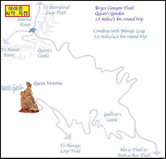 이 코스는 Sunrise Point 에서 출발하는데 왕복 1.8 마일 ( 약 3.0 Km ) 의 거리인데 소요 시간은 1 시간 30분 정도 걸린다.