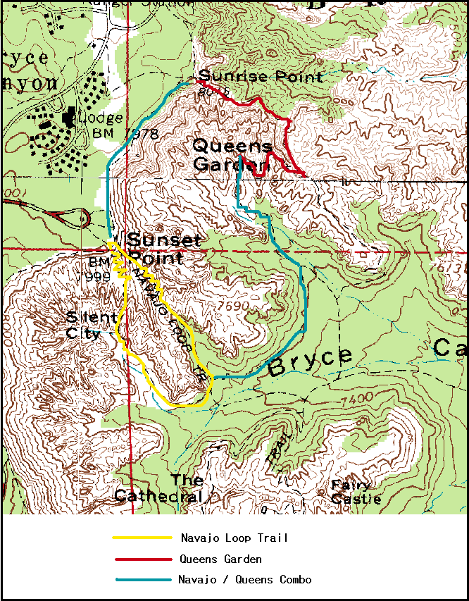하이킹 코스 Navajo Loop Trail 지도에서 노란색으로 표시된 코스인데 왕복 1시간 30분은 잡아야 한다. Queens Garden 지도에서 빨간색으로 표시된 등산 코스인데 ( Navajo / Queens ) Combo Navajo Loop 와 Queens Garden 의 등산로를 연결한 것으로