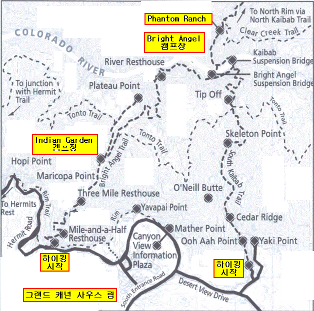 << Bright Angel Trail 과 South Kaibab Trail 하이킹 코스 설명도 >>