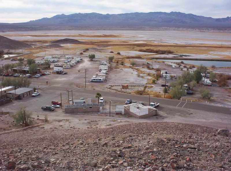 <<< Tecopa 온천 지역의 전경 / 언덕 아래 왼쪽 건물이 남탕, 그리고 오른쪽 건물이 여탕임 >>>
