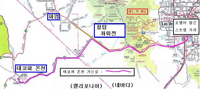 라스베가스에서는 시 외곽 도로를 따라, 스프링 마운틴 ( Spring Mountain )을 넘어, 퍼람 ( Pahrump ) 으로 가는 길을 따라 가다가, 테코파 가는 길이란 펫말을 보고 좌회전하여 옛 스페니쉬 길 ( Spanish Trail Highway )을 따라 가면 된다.