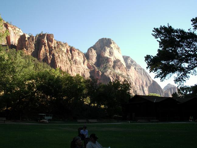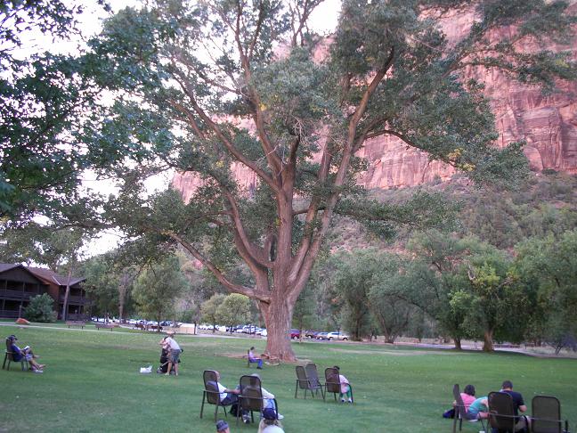 << 공원내 Zion Lodge 에서 나무 그늘 아래서 휴식을 즐기고 있는 관광객들의 모습 >>