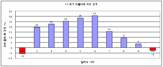 그러나 딜러의 카드가 10일 경우에는히트하여 유리한 정도가 1% 밖에 되지 않는다.
