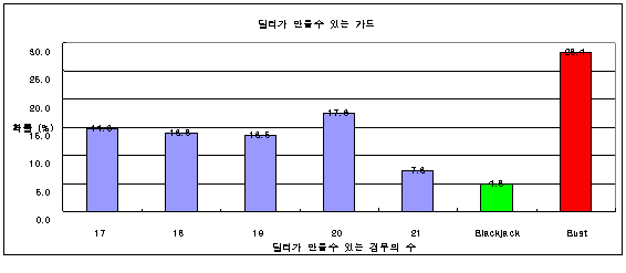 확률은 28.4 % (2) 딜러가 버스트 나지 않고 17~21 사이의