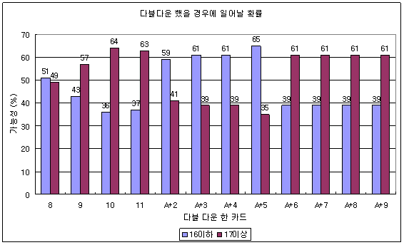 위 도표에서 보면, 예를들면 그런데 실제 게임을 할 때에는 물론 하늘색으로 표시된 곳에서는 다블다운 한다. 그리고