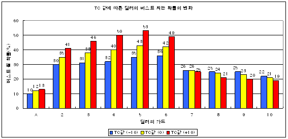 카드 카운팅하여 알아본 딜러의 버스트 TC 가 0 인 상태 ( 기초 전술의 기준 ) 와 TC 가 (+10) 인 상태 그리고 TC ( -10 ) 인 상태마다, 가지고