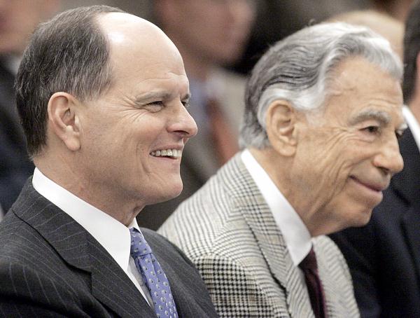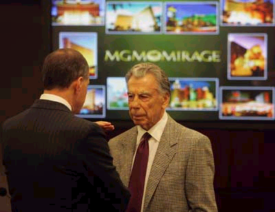 2005년 2월 만달레이 그룹을 인수하면서 전문 경영인 테리 레이니( Terri Lanni /왼쪽 )와 이야기를 나누고 있는 88세의 커크 커코리언 ( Kirk Kerkorian / 오른쪽 )의 모습