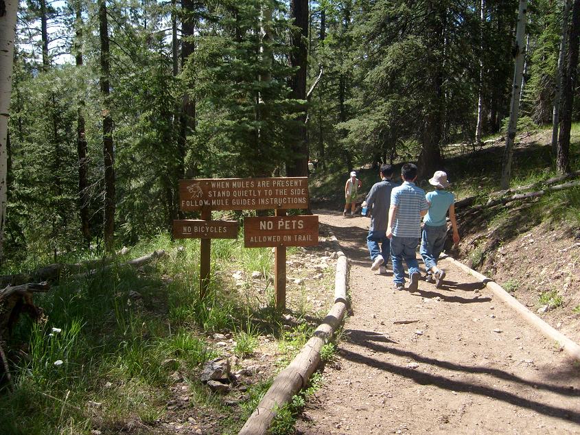 이런 계곡으로의 등산은 한국의 산(山)을 등산하는 것과는 정반대이다. 또 North Kaibab Trail 이길은 계곡 아래까지 말이 등산객을 싣고 나르는 길로 사용되는데 냄새나는 길을 따라 20분 정도 내려가면 Coconino Overlook 이라는 전망대가 나왔다.